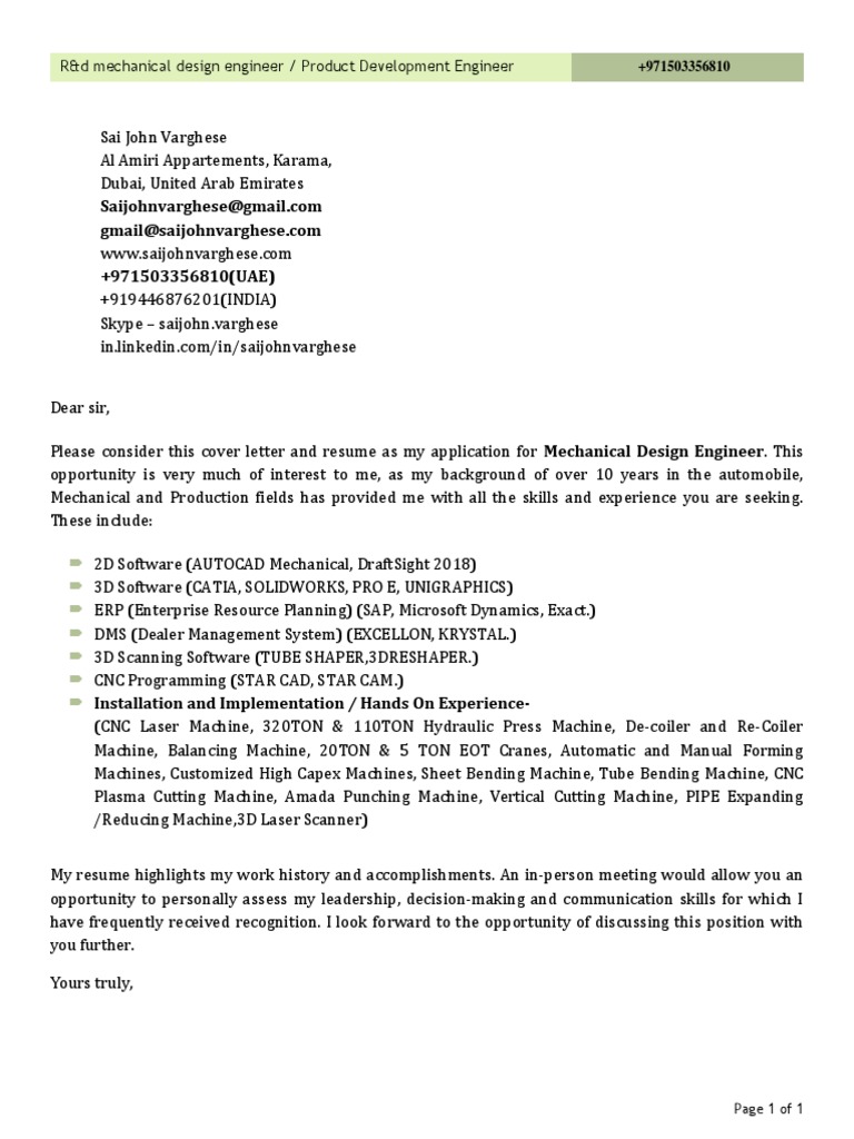 Cover Letter For Mechanical Design Engineer : My resume is now one page long, not three.with the same stuff.. Additionally, you can learn about engineering careers and search for mechanical engineer jobs on monster. Mechanical engineer cover letter sample 2: For help with your resume, check out our extensive mechanical engineer resume samples. How to write a cover letter for software engineer. In addition to my experience and personal qualities, i have a solid educational foundation and a passion for engineering and mechanical designing.